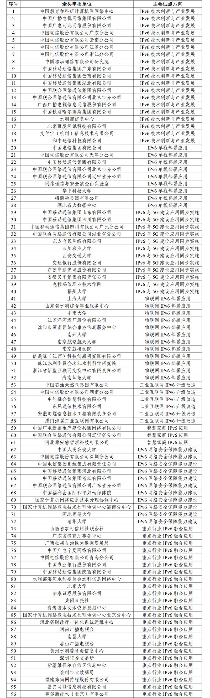 IPv6技术创新和融合应用试点项目名单